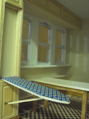 This is the main classroom in the Beacon Hill Girls' School. In the foreground is a small teaching area (what subject, I don't know yet!)with a standing chalkboard on the right that I'll show in more detail later. In the background, you can see a hint of the traditional American schoolhouse desks sitting on some checkboard patterned paper. That's my way of trying out different flooring ideas.